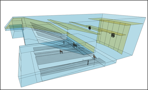 O modelo apresentou volume de aproximadamente 3.082 m³ e coeficiente médio de absorção de 0,32, indicando a necessidade de controle do campo reverberante para atingir níveis adequados de inteligibilidade.
